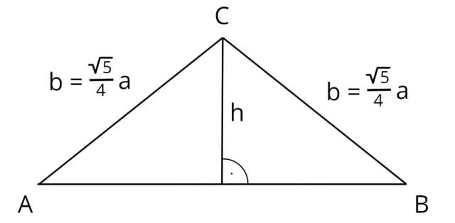 Zapisz stosunek między długością podstawy, a długością ramienia. Opisz wysokość opuszczoną z wierzchołka C, za pomocą niewiadomej a, korzystając z twierdzenia Pitagorasa. Wiedząc ile wynosi pole danego trójkąta oblicz długość podstawy, następnie oblicz długość ramienia.