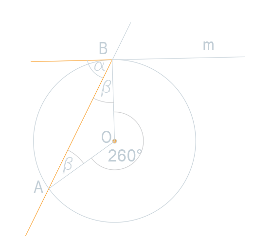 Znajdź miarę kąta α, jeśli prosta m jest styczna z okręgiem.