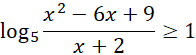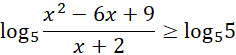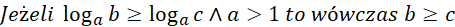 W pierwszej kolejności zapiszemy założenia. Liczba logarytmowana musi być większa od 0, jest to nasza pierwsza nierówność, oczywiście mianownik nie może być równy 0. Możemy zauważyć, że licznik to wzór skróconego mnożenia, który możemy zwinąć. Odrzucamy następnie liczbę zerującą licznik i aby równość była zachowana, wystarczy, że mianownik będzie większy od 0, gdyż licznik jest zawsze większy od zera jako kwadrat. Następnie prawą stronę nierówności zapisujemy jako logarytm o podstawie 5 i korzystamy z własności funkcji logarytmicznej, a mianowicie z tego, że jest ona rosnąca na całej swojej dziedzinie, czyli wraz ze wzrostem argumentów wzrastają również wartości. W ten sposób doprowadziliśmy do równoważnej nierówności wymiernej, którą rozwiązujemy poprzez przemnożenie obu stron przez kwadrat mianownika, pogrupowaniu naszkicowaniu wykresu i zapisaniu odpowiedzi z uwzględnieniem wszystkich założeń.