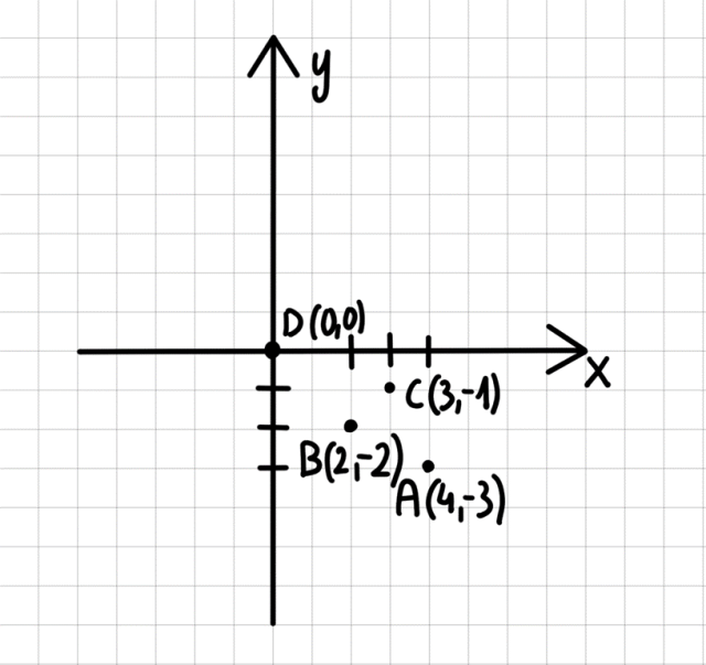 A = (4, -3), B = (2, -2), C = (3, -1), D = (0, 0).