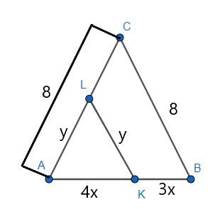 Mamy trójkąt ABC, w którym |AC| = |BC| = 8. Na bokach AB i AC zostały obrane odpowiednio punkty K i L takie, że |KL| = |AL.|. Musisz wyznaczyć długość odcinka KL, jeżeli wiadomo, że