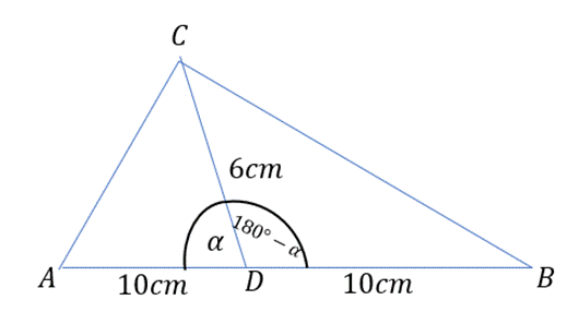 Środkowa CD dzieli bok AB: |AD| = |DC| = 10 cm