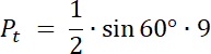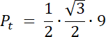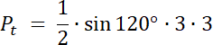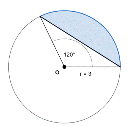 W pierwszym kroku zauważ, że pole zamalowanego obszaru na niebiesko to różnica pól: wycinka koła o kącie 120° i pola trójkąta równoramiennego, o ramieniu o długości 3. Oblicz te pola i wyznacz ich różnicę–otrzymany wynik to pole odcinka koła.