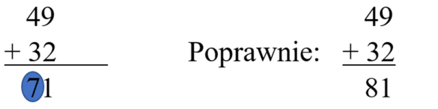 Musisz pamiętać o tym, aby dodając liczby przenosić wartości z niższego rzędu do wyższego.