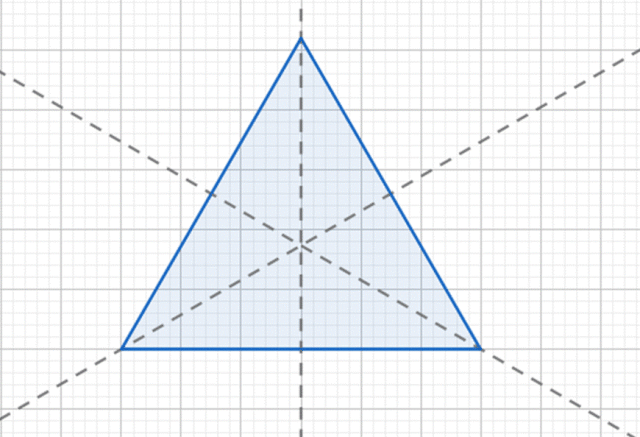 Pamiętaj, trójkąt równoboczny ma boki takiej samej długości i kąty tej samej miary. Oś symetrii to prosta, która dzieli figurę na dwie identyczne części. Trójkąt równoboczny ma 3 osie symetrii.