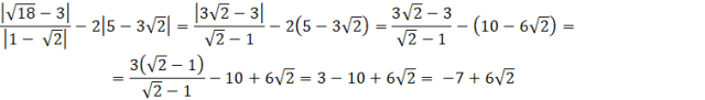 Aby rozwiązać zadanie zacznij od oszacowania znaków wyrażeń znajdujących się pod symbolami wartości bezwzględnej. Następnie odpowiednio opuść symbole wartości. Uprość otrzymane wyrażenie przez kolejno wymnożenie wyrażenia w nawiasie, wyłączenia wspólnego czynnika przed nawias wyrażenia w liczniku ułamka i skrócenie ułamka. Następnie zredukuj jednomiany podobne.