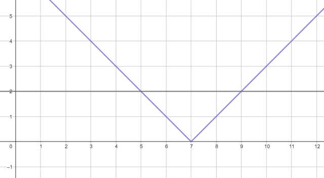 Aby rozwiązać nierówność, narysuj wykresy funkcji y = |x - 7| oraz y = 2. Rozwiązaniami będą te argumenty, dla których wykres funkcji y = 2 znajduje się nad wykresem funkcji y = |x - 7|.