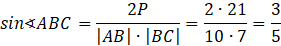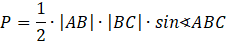 Przekształć wzór, gdzie pole równa się połowie iloczynu długości 2 boków i sinusa kąta między nimi tak, by wyznaczyć wartość sinusa. Następnie oblicz ją przez podstawienie do wzoru danych w treści wartości.