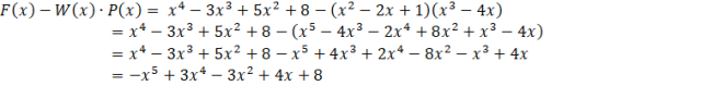 Aby rozwiązać zadanie wykonaj mnożenie W(x) razy P(x), a następnie odejmij otrzymany wielomian od F(x). Następnie zredukuj jednomiany podobne i uszereguj malejąco otrzymany wielomian.