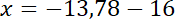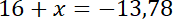 Zapisz po jednej stronie równości dodawanie liczby 16 i liczby x, a po drugiej stronie znaku – wynik tego dodawania, czyli liczbę (–13,78).Pamiętaj, brakujący składnik obliczysz, odejmując od sumy pierwszy składnik.