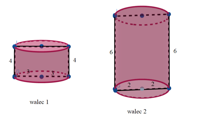 W tym zadaniu porównaj objętość i pola powierzchni całkowitej dwóch różnych walców wiedząc, że mają one taki sam przekrój osiowy, który jest prostokątem o wymiarach 4 x 6.
