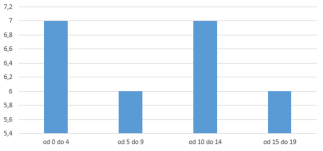 Sporządź diagram słupkowy z danymi pogrupowanymi w cztery przedziały równej długości.