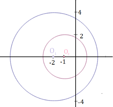 Oznaczamy środki okręgów, odmierzamy ich promienie i rysujemy w układzie współrzędnych. Odległość między środkami okręgów o środkach