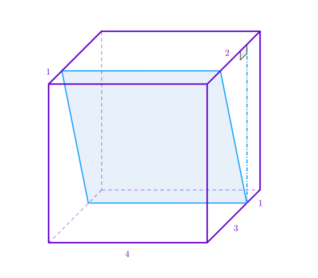 Przekrój bryły jest prostokątem. Jedna para boków przekroju ma długość krawędzi sześcianu. Długość drugiej pary oblicz za pomocą twierdzenia Pitagorasa: