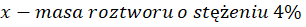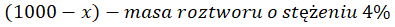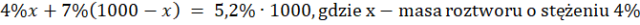 W tym zadaniu musisz zapisać związek pomiędzy masami użytych roztworów przy pomocy równania, jeżeli zmieszano pewne ilości roztworów 4% i 7% i otrzymano 1000g roztworu 5,2%.