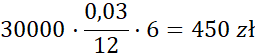 W tym zadaniu oblicz wysokość wkładu wraz z odsetkami po upływie 6 miesięcy, wiedząc, że kwotę 30 000 zł wpłacono do banku na półroczną lokatę odnawialną z oprocentowaniem 3% w stosunku rocznym. W obliczeniach uwzględnij podatek od odsetek w wysokości 20%.