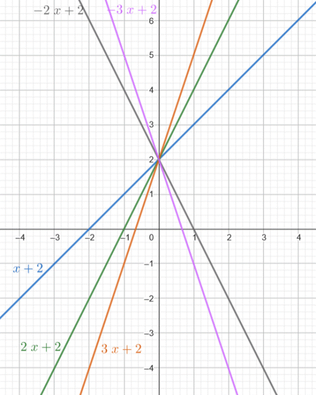 Zauważ, że każda z prostych przecina ona oś OY w punkcie (0,2), a wzrost argumentu o jedną jednostkę odpowiada wzrostowi funkcji odpowiednio o 1, 2 oraz 3 lub spadek o -2 oraz -3 jednostki.