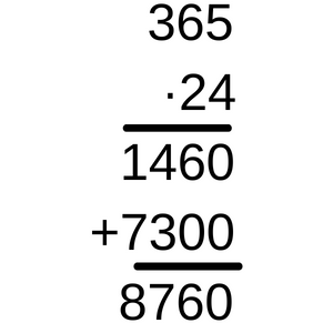 Liczbę dni w roku zwykłym pomnóż przez liczbę godzin w dobie, by dostać liczbę godzin w roku zwykłym. Wykonując mnożenie pisemne przez liczbę wielocyfrową, należy najpierw pomnożyć cyfrę jedności liczby, przez którą mnożysz, przez cyfrę jedności drugiej liczby. Jeśli otrzymana liczba jest dwucyfrowa, należy cyfrę jedności takiego wyniku zapisać pod słupkiem cyfr jedności, a cyfrę dziesiątek z wyniku trzeba przenieść dalej poprzez dopisanie tej cyfry nad kolejnym w lewo słupkiem, czyli słupkiem cyfr dziesiątek. Przy mnożeniu kolejnego słupka, do wyniku dodaje się przeniesioną cyfrę ze słupka wcześniej. W taki sam sposób należy mnożyć każdą kolejną cyfrę, zaczynając od lewej i idąc do prawej. Jeśli w ostatnim słupku wyjdzie liczba większa od 10, to już nie wolno przenosić dalej, bo nie ma kolejnego słupka, lecz należy napisać całą liczbę. Po pomnożeniu przez cyfrę jedności należy wykonać te same operacje, mnożąc przez kolejne cyfry, zaczynając od dziesiątek. Z każdą kolejną cyfrą, przez którą mnożysz w sekcji dodawania, dopisuj z prawej strony jedno zero. Na końcu wykonaj dodawanie pisemne. Dodawaj kolejno każdy ze słupków, począwszy od jedności, a gdy po dodaniu wynik będzie dwucyfrowy, to liczbę jedności zapisz pod tym słupkiem, a liczba dziesiątek przejdzie dalej do następnego słupka.