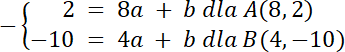 W tym zadaniu skorzystaj ze wzoru na równanie kierunkowe prostej, y = ax + b, wstaw współrzędne punktów, które należą do prostej i wyznacz wartości współczynników a i b.