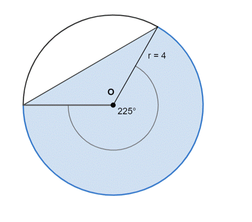 W pierwszym kroku zauważ, że pole zamalowanego obszaru na niebiesko to suma pól: wycinka koła o kącie 225° i pola trójkąta równoramiennego o kącie między ramionami równym 135° i ramieniu o długości 3. Oblicz te pola i wyznacz ich sumę–otrzymany wynik to pole odcinka koła.