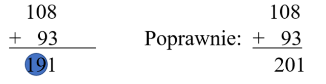 Musisz pamiętać o tym, aby dodając liczby przenosić wartości z niższego rzędu do wyższego.