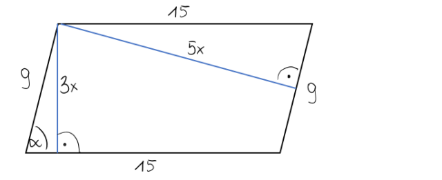 W tym zadaniu musisz obliczyć pole równoległoboku i jego wysokości wiedząc, że wysokości pozostają w stosunku 3 : 5, jeden bok jest o 6 dłuższy od drugiego, a sinus kąta ostrego równoległoboku jest równy .