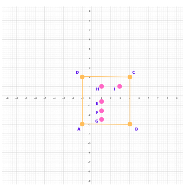 Na początek w układzie współrzędnych rysunek podane wierzchołki i połącz w kwadrat. Następnie wewnątrz kwadratu narysuj takie współrzędne DEFG, aby x był całkowity, a y nie. Odczytaj ich współrzędne.