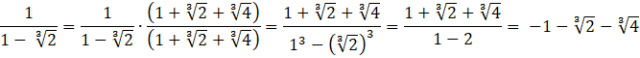 Aby usunąć niewymierność z mianownika skorzystaj ze wzoru skróconego mnożenia na różnicę sześcianów. Rozszerzamy licznik i mianownik ułamka razy