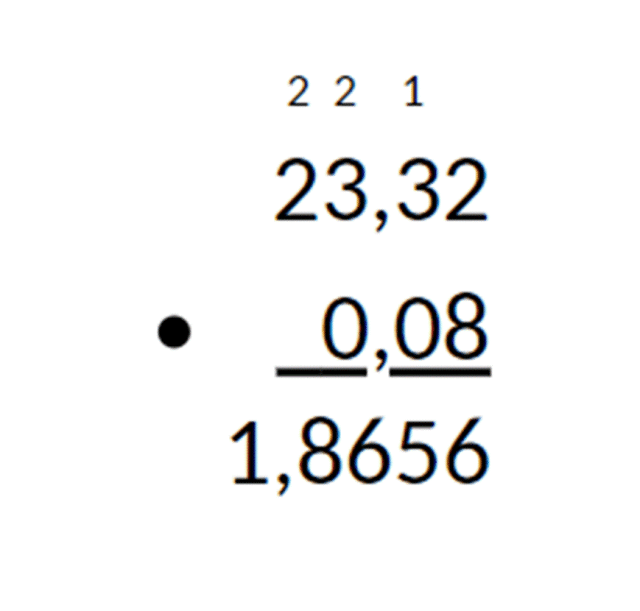Zapisz liczby tak, aby ostatnia cyfra jednego czynnika stała nad ostatnią cyfrą drugiego czynnika. Mnóż pierwszą liczbę przez ostatnią cyfrę liczby pod nią, nie musisz zapisywać mnożenia przez kolejne cyfry, czyli zera. Na koniec wstaw przecinek na takim miejscu, ile miejsc łącznie było po przecinku w obydwu czynnikach.