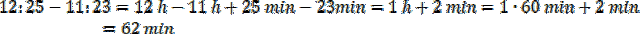 Aby policzyć różnicę czasu, odejmij od siebie osobno godziny i minuty, a następnie zamień godziny na minuty pamiętając o tym, że jedna godzina to 60 min.