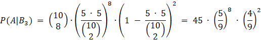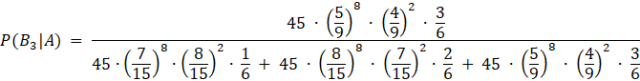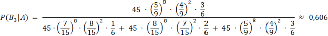Oblicz prawdopodobieństwo zajścia zdarzeń, od których jest zależne zdarzenie A, a następnie korzystając z twierdzenia o prawdopodobieństwie całkowitym i schematu Bernoulliego oblicz prawdopodobieństwo zdarzenia A i na podstawie otrzymanych danych oblicz prawdopodobieństwo wylosowania kul z trzeciej urny, jeśli wylosowano 8 razy kule w różnych kolorach. Zapisz to w następujący sposób: