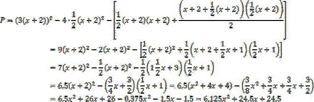 Pole tej figury oblicz odejmując od pola całego kwadratu o boku 3(x + 2), 4 pola trójkątów prostokątnych równoramiennych o przyprostokątnych równych (x + 2) – to są „ścięte rogi kwadratu”. Musisz odjąć jeszcze figurę ze środka – jej pole policz, sumując dwa trapezy równoramienne i prostokąt.