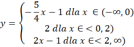 Wzór ogólny funkcji liniowej ma postać: y = ax + b, wiedząc, że funkcja ta przecina oś OY w punkcie (0,-1) to współczynnik b = -1. Do wykresu tej funkcji należy punkt A(1, 1), zatem podstawiając go do wzoru, otrzymasz następujący wzór: