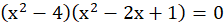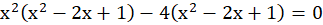 Przekształcasz wyrażenie do postaci umożliwiającej wyłączenie wspólnego czynnika przed nawias. Następnie wykorzystujesz wzór na różnice kwadratów do rozbicia jednego z powstałych nawiasów i wzór na kwadrat różnicy do przekształcenia drugiego nawiasu. Pierwiastki odczytujesz z otrzymanej postaci iloczynowej.