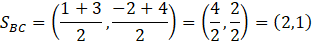 Prosta s2 zawierająca środkową wychodzącą z boku BC, przechodzi przez punkty SBC oraz A. Więc jej współczynnik kierunkowy możesz wyliczyć, ze wzoru na współczynnik kierunkowy prostej przechodzącej przez punkty (x1, y1) oraz (x2, y2).