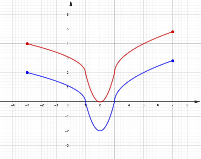 Na podany obok rysunku przedstawiony jest wykres funkcji f, którego dziedziną jest przedział ⟨-3, 7⟩. Narysuj wykres funkcji g(x) = f(x) + 2. Podaj jej dziedzinę, zbiór wartości i miejsce zerowe.