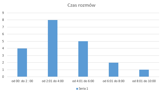 Na podstawie tabeli z zapisanym czasem trwania (w minutach) 20 rozmów przeprowadzonych z pewnego telefonu, stwórz diagram słupkowy.