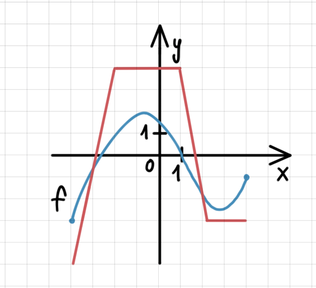 Dorysuj funkcję g, która będzie przecinać się z funkcją f dla x = -3 oraz x = 2, tak aby wartości funkcji g były większe od wartości funkcji f w tym przedziale (wykres funkcji g ma być nad wykresem funkcji f). Funkcja g ma również przecinać oś x w 2 punktach – czyli mieć dwa miejsca zerowe.