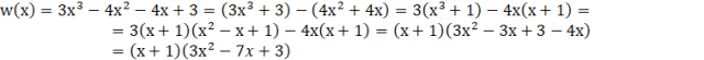 Rozkładamy wielomiany na czynniki korzystając z metody grupowania lub wyliczenia miejsc zerowych funkcji kwadratowej i jej postaci iloczynowej.