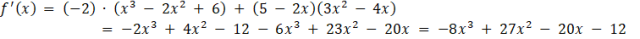 W tym zadaniu musisz znaleźć pochodną funkcji f na dwa sposoby – korzystając ze wzoru na pochodną iloczynu funkcji oraz wymnażając czynniki w podanym wzorze funkcji i obliczając pochodną wielomianu.