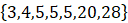 Podane rozwiązanie jest przykładowe. Powinieneś podać tutaj taki zbiór liczb, których suma wynosi 210, trzy spośród liczb jest mniejszych niż 10, a trzy większe od 10.