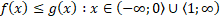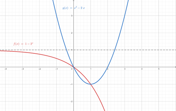 Naszkicuj wykresy funkcji f i g. Zapisz przedział, w którym wykres funkcji g znajduje się nad wykresem funkcji f lub jest mu równy. Pamiętaj o domknięciu przedziału rozwiązania nierówności w wartościach rzeczywistych – w plus i minus nieskończoności przedziały są zawsze otwarte, ponieważ nie znamy ich konkretnej wartości.