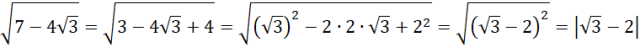 7 pod pierwiastkiem rozbij na sumę liczb 3 i 4, a następnie zauważ wzór skróconego mnożenia na kwadrat różnicy: