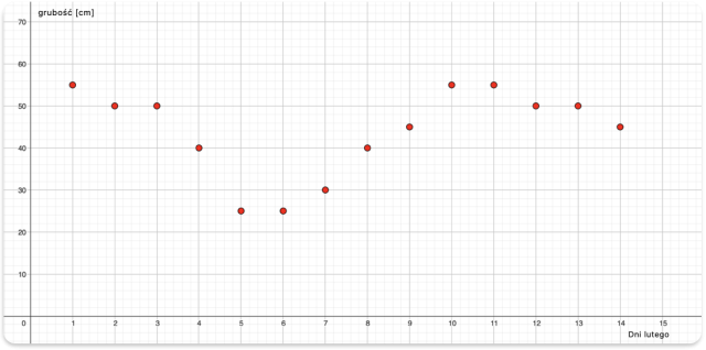 W tym zadaniu musisz podać dla jakich x wartość funkcji przyjmuję najmniejszą wartość, jeżeli wykres przedstawia zmierzoną grubość pokrywy śnieżnej przez 14 dni lutego.