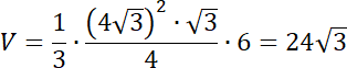 Wyznacz objętość tego ostrosłupa, jeżeli jego podstawą jest trójkąt, wysokość ostrosłupa prawidłowego wynosi 6, a promień okręgu opisanego na jego podstawie jest równy 4.