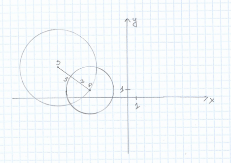 Musisz ustalić, jak są położone względem siebie dwa okręgi, jeśli jeden z nich ma środek w punkcie S = ( – 9,4) i promień długości 5, a drugi ma środek w punkcie P = ( – 5,1) i promień długości 3.
