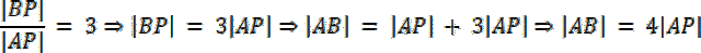 Na początku wyznacz stosunek boku |AP| do boku |AB|, następnie skorzystaj z informacji, że stosunki długości boków, są równe stosunkom długości wektorów i na tej podstawie wyznacz wektor AP, a następnie współrzędnie punktu P.