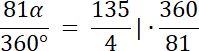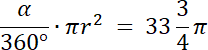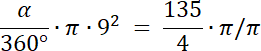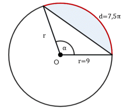 W pierwszym kroku zauważ, że pole zamalowanego obszaru na niebiesko to różnica pól: wycinka koła o długość łuku okręgu równym 7,5π i pola trójkąta równoramiennego o kącie między ramionami równym α i ramieniu o długości 9. Wyznacz pole wycinka i przyrównaj go do drugiego wzoru na pole wycinka, aby wyznaczyć kąt α, a następnie oblicz pole trójkąta. Pole odcinka to różnica pół: wycinka koła o długości łuku okręgu i pola trójkąta równoramiennego.