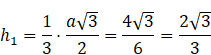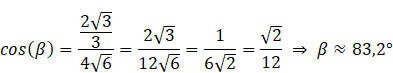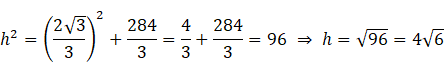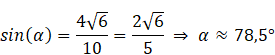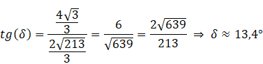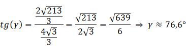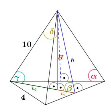 Wyznacz wartości funkcji trygonometrycznych: sin(α), cos(β), tg(γ), tg(δ), a następnie wyznacz miary tych kątów w ostrosłupie prawidłowym trójkątnym o długości krawędzi podstawy 4 i długości krawędzi bocznej 10.
