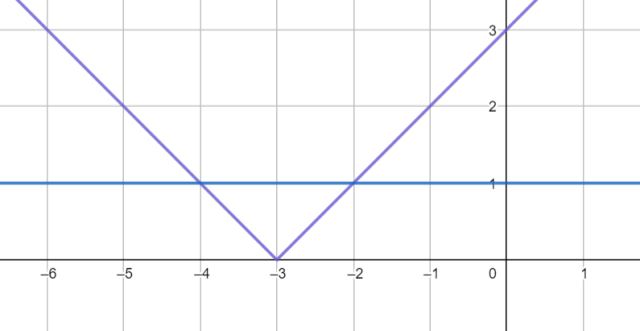 Aby rozwiązać nierówność, narysuj wykresy funkcji y = |-3 - x| (kolor fioletowy) oraz y = 1 (kolor niebieski). Rozwiązaniami będą te argumenty, dla których wykres funkcji y = 1 znajduje się pod wykresem funkcji y = |-3 – x|.